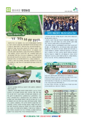 03 %ud48d%uc694%ub85c%uc6b4 %uccad%uc815%ub18d%uc5c5 2025%ub144 9%uc6d4 2%uc77c(%ud654)%uc77c%uc7909. 1. %uce60%uc131 %uac08%ub860 %uac08%ub8609. 3. %ubd88%uc815 %ub355%ucd0c %uc11d%uc815,%ub355%ucd0c9. 5. %uc18c%uc218 %uae38%uc1203 %uae38%uc1202, 3, %uc218%ub9ac39. 8. %uc5f0%ud48d %uc785%uc11d %uc785%uc11d9. 10. %ubb38%uad11 %uc2e0%uae301 %uc2e0%uae301, 29. 12. %uccad%uc548 %ud6a8%uadfc3 %ud6a8%uadfc2,39. 15. %ubd88%uc815 %uc5f0%uc9c0 %uc5f0%uc9c09. 17. %uccad%ucc9c %ud3c9%ub2e8 %ud3c9%ub2e89. 19. %uac10%ubb3c %ud558%uc720%ucc3d %uc0c1%uc720%ucc3d,%ud558%uc720%ucc3d9. 22. %uc7a5%uc5f0 %uc11d%uc0b0 %uc11d%uc0b09. 24. %ubd88%uc815 %uc6d0%uc6c5%ub3d9 %uc6d0%uc6c5%ub3d99. 26. %uccad%ucc9c %uc6d4%ubb38 %uc6d4%ubb389. 29. %uce60%uc131 %uc1a1%ub3d9 %uc1a1%ub3d9%uc74d%uba74 %uc218%ub9ac%ub9c8%uc744 %ub300%uc0c1%ub9c8%uc744%u203b %uc0c1%uae30%uc77c%uc815%uc740%uae30%uc0c1%uc0c1%ud669 %ub4f1%uc5d0%ub530%ub77c %ubcc0%uacbd%ub420 %uc218%uc788%uc2b5%ub2c8%ub2e4.%ubb38%uad11%uc800%uc218%uc9c0%uc640 %uc0ac%ub9ac %uafc0%ubc8c%ub79c%ub4dc %uc778%uadfc %ub17c%uc5d0 %uc720%uc0c9%ubcbc%ub97c %ud65c%uc6a9%ud55c %ub3c5%ucc3d%uc801%uc778%ub17c %uadf8%ub9bc%uc774 %uc870%uc131%ub418%uc5b4 %ub18d%ucd0c%uc744 %ucc3e%ub294 %ubc29%ubb38%uac1d%ub4e4%uc5d0%uac8c %uc0c9%ub2e4%ub978 %ubcfc%uac70%ub9ac%ub97c %uc120%uc0ac%ud558%uace0 %uc788%uc2b5%ub2c8%ub2e4. %uc62c%ud574 %uc870%uc131%ub41c %ub17c %uadf8%ub9bc%uc758 %ucd1d %uaddc%ubaa8%ub294 1%ub9cc3,980%u33a1%uc5d0 %ub2ec%ud569%ub2c8%ub2e4.%ubb38%uad11%uc800%uc218%uc9c0 %uc77c%uc6d0 1%ub9cc693%u33a1%uc5d0%ub294 %ud48d%uc18d%ud654 %ub300%uac00 %uae40%ud64d%ub3c4%uc758 %ub300%ud45c%uc791%u2018%ubb34%ub3d9(%u821e%u7ae5)%u2019%uc744 %ud615%uc0c1%ud654%ud574 %uc5ed%ub3d9%uc801%uc778 %uc7a5%uba74%uc744 %ub2f4%uc558%uc73c%uba70, %uc0ac%ub9ac %uafc0%ubc8c%ub79c%ub4dc %uc778%uadfc3,287%u33a1%uc5d0%ub294 %uafc0%ubc8c%uc774 %uafc0%uc744 %ucc44%uc9d1%ud558%ub294 %ubaa8%uc2b5%uc744 %uadc0%uc5ec%uc6b4 %uce90%ub9ad%ud130%ub85c %ud45c%ud604%ud588%uc2b5%ub2c8%ub2e4.%uc774%ubc88 %uc791%ud488%uc5d0%ub294 %uad34%uc0b0%uad70%uc774 %ubcf4%uc720%ud55c %ud2b9%ud5c8 %uae30%uc220%u2018%uc720%uc0c9%ubcbc%ub97c %uc774%uc6a9%ud55c %ub17c%uc758%uadf8%ub9bc %ud615%uc131%ubc29%ubc95%u2019(%ud2b9%ud5c8 %uc81c10-1075121%ud638)%uc774 %uc801%uc6a9%ub410%uc2b5%ub2c8%ub2e4. %ub2e4%uc591%ud55c %uc0c9%uc758 %ubcbc%ub97c %ub3c4%uc548%uc5d0 %ub9de%ucdb0 %uc815%uad50%ud558%uac8c %uc2ec%uc5b4 %uc644%uc131%ud558%ub294 %ubc29%uc2dd%uc73c%ub85c, %ub77c%uc6b8%uc601%ub18d%uc870%ud569%ubc95%uc778%uacfc%uccad%ub144%ub18d%uc5c5%uc778 %ub2e8%uccb4 4-H%uac00 %ucc38%uc5ec%ud574 %ubb38%uad11%uc800%uc218%uc9c0 %ub17c %uadf8%ub9bc%uc744 %uc870%uc131%ud588%uc2b5%ub2c8%ub2e4.%uc720%uc0c9%ubcbc %ub17c %uadf8%ub9bc%uc740 %uad34%uc0b0%uace0%ucd94%ucd95%uc81c, %uc0b0%ub9c9%uc774%uc61b%uae38, %uad34%uac15%uad00%uad11%uc9c0 %ub4f1 %uc778%uadfc %uad00%uad11%uc9c0%uc640 %uc5f0%uacc4%ud574 %uc624%ub294 10%uc6d4 %uc218%ud655%uae30%uae4c%uc9c0 %uad00%ub78c%uac1d%ub4e4%uc5d0%uac8c %uc990%uac70%uc6c0%uc744 %uc120%uc0ac%ud560 %uac83%uc73c%ub85c %uae30%ub300%ub429%ub2c8%ub2e4.%uad34%uc0b0%uad70%uc758 %ub18d%uc0b0%ubb3c%uc744 %uc548%uc815%uc801%uc73c%ub85c %uacf5%uae09%ud558%uae30 %uc704%ud55c %ub85c%uceec%ud478%ub4dc %uc720%ud1b5%uc13c%ud130%uac00%uc0c8%ub86d%uac8c %uc870%uc131%ub429%ub2c8%ub2e4.%uc720%ud1b5%uc13c%ud130%ub294 %uad34%uc0b0%uc74d %uc81c%uc6d4%ub9ac 895%ubc88%uc9c0 %uc77c%uc6d0%uc5d0 %uc5f0%uba74%uc801 1,264.75%u33a1 %uaddc%ubaa8%ub85c%uc870%uc131%ub418%uba70, %uc2e0%uc120 %ub18d%uc0b0%ubb3c%uc758 %uc9d1%ud558%ubd80%ud130 %uc608%ub0c9, %uc800%uc628%uc800%uc7a5, %uc120%ubcc4, %ud3ec%uc7a5, %ubc30%uc1a1%uae4c%uc9c0 %uc6d0%uc2a4%ud1b1 %ucc98%ub9ac%uac00 %uac00%ub2a5%ud55c %uce5c%ud658%uacbd %uc0b0%uc9c0%uc720%ud1b5%uc2dc%uc124%ub85c %uc6b4%uc601%ub429%ub2c8%ub2e4. %ub0b4%ubd80%uc5d0%ub294 %u25b2%uac80%uc218 %ubc0f %uc785%ucd9c%uace0%uc7a5(90%u33a1), %u25b2%uc608%ub0c9%uc2e4(33%u33a1), %u25b2%uc800%uc628%uc800%uc7a5%uace0 (5%uc2e4,684%u33a1), %u25b2%uc791%uc5c5%uc7a5(358%u33a1), %u25b2%uacf5%uc6a9%uacf5%uac04(98%u33a1) %ub4f1%uc774 %uac16%ucdb0%uc9d1%ub2c8%ub2e4. %ub610%ud55c%ub18d%uc0b0%ubb3c%uc758 %uc21c%ud68c %uc218%uc9d1%uacfc %ubc30%uc1a1%uc744 %uac15%ud654%ud558%uae30 %uc704%ud574 1%ud1a4 %uc804%uae30%ud0d1%ucc28 3%ub300, 3.5~4.5%ud1a4 %ub0c9%ub3d9%ud0d1%ucc28 2%ub300 %ub4f1 %ucd1d 5%ub300%uc758 %uc6b4%uc1a1 %ucc28%ub7c9%ub3c4 %ud568%uaed8 %ud655%ubcf4%ud574 %uc6b4%uc601%ud560 %uacc4%ud68d%uc785%ub2c8%ub2e4. %ub85c%uceec%ud478%ub4dc %uc720%ud1b5%uc13c%ud130%ub294 %uc9c0%uc5ed %ub18d%uac00%uc5d0 %uc548%uc815%uc801%uc778 %ud310%ub85c%ub97c %uc81c%uacf5 %ud558%uace0,%uc8fc%ubbfc%uc5d0%uac8c%ub294 %uc2e0%uc120%ud558%uace0 %uc548%uc804%ud55c %uba39%uac70%ub9ac%ub97c %uacf5%uae09%ud558%ub294 %uc5ed%ud560%uc744 %ud558%uac8c %ub429%ub2c8%ub2e4.%ud2b9%ud788 %ud5a5%ud6c4 %ud559%uad50%uae09%uc2dd%uacfc %uacf5%uacf5%uae09%uc2dd%uacfc %uc5f0%uacc4%ud574 %uc9c0%uc5ed %ub18d%uc0b0%ubb3c %uc18c%ube44%ub97c %ud655%ub300%ud558%uace0, %ub18d%uc5c5%uc778 %uc18c%ub4dd %uc99d%ub300%uc640 %uc77c%uc790%ub9ac %ucc3d%ucd9c%uc5d0%ub3c4 %uae30%uc5ec%ud560 %uac83%uc73c%ub85c %uae30%ub300%ub429%ub2c8%ub2e4.%uc644%uacf5 %uc774%ud6c4%uc5d0%ub294 %uad34%uc0b0%uad70%ubfd0 %uc544%ub2c8%ub77c %uc778%uadfc %uc9c0%uc790%uccb4%uc5d0%ub3c4 %ub18d%uc0b0%ubb3c%uc744 %uc548%uc815%uc801%uc73c%ub85c%uacf5%uae09%ud560 %uc218 %uc788%ub294 %uacf5%uacf5%uae09%uc2dd %ud575%uc2ec %uae30%uc9c0%ub85c %uc790%ub9ac%ub9e4%uae40%ud560 %uc804%ub9dd%uc785%ub2c8%ub2e4.%uad34%uc0b0%uad70%uc740 %ub18d%ucd0c %uc77c%uc190 %ubd80%uc871%uc744 %ud574%uc18c%ud558%uae30 %uc704%ud574 %uc678%uad6d%uc778 %uacc4%uc808%uadfc%ub85c%uc790%uc81c%ub3c4%ub97c %uc6b4%uc601%ud558%uace0 %uc788%uc2b5%ub2c8%ub2e4.%uadfc%ub85c%uc790%ub294 %ube0c%ub85c%ucee4 %uac1c%uc785 %uc5c6%uc774 %uce84%ubcf4%ub514%uc544 %ud611%ub3d9%uc870%ud569%uacfc %uc1a1%ucd9c%uccad%uc774 %uc9c1%uc811%uc120%ubc1c%ud569%ub2c8%ub2e4. %ud55c%uad6d %uc720%ud559 %uacbd%ud5d8%uc774 %uc788%ub294 %uc778%ub825%ub3c4 %ucc38%uc5ec%ud574 %uc18c%ud1b