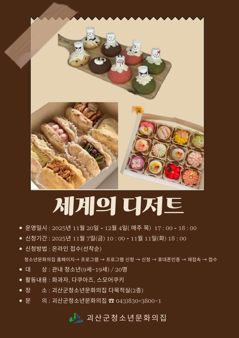 2. 신청기간: 11월 7일(금) 10:00~11월 11일(화) 18:00 3. 신청방법: 온라인 접수(선착순) 4. 문의: 괴산군청소년문화의집 043)830-3800~1 |